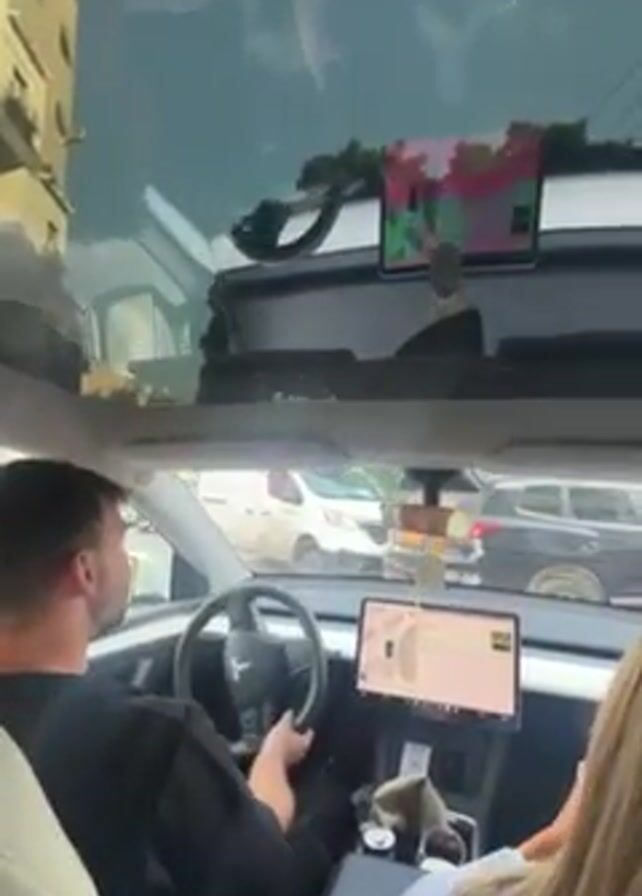 A Tesla is stopped in traffic. A man is in the driver's seat, with a female passenger beside him. The car has a glass roof, and there are two monitors attached above the rear-view mirror. The Tesla's dashboard screen displays a map. A building can be seen through the windshield.