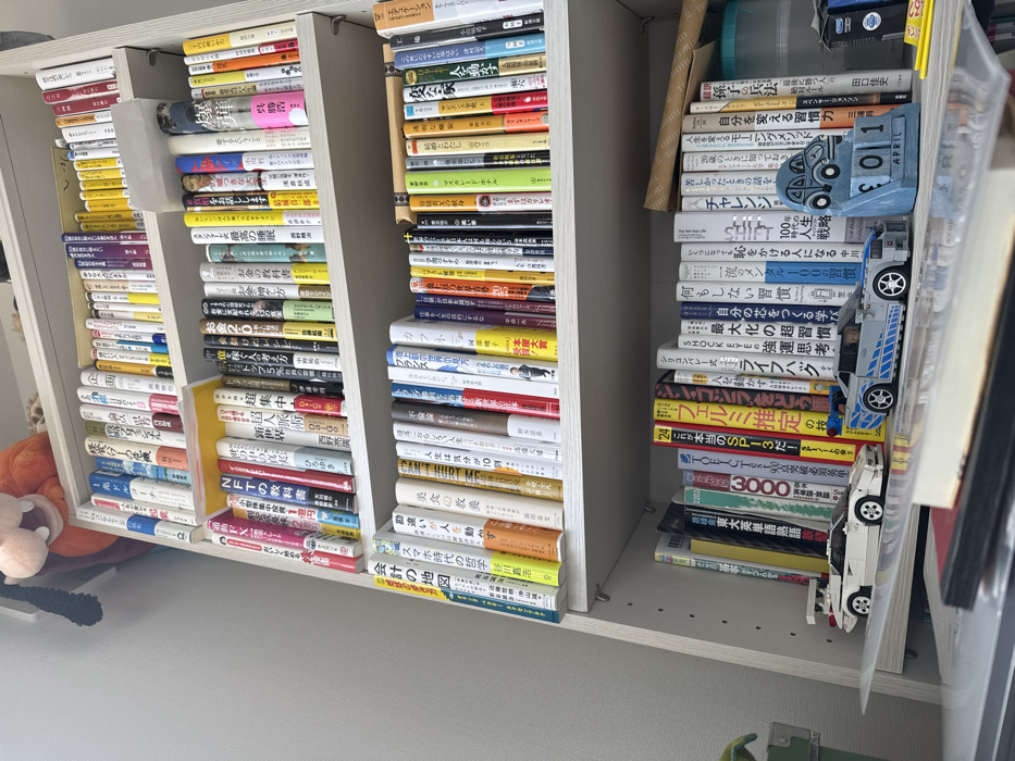 This image depicts an interior scene, located within the city of Setagaya, Japan. The central focus is a white, multi-shelf bookcase positioned against a light-colored wall. The uppermost section of the bookcase features two plush toys: a black and white character resembling Disney's Goofy, positioned on the left, and an orange-red character partially visible on the right. The bookcase contains four visible shelves, each densely packed with books, predominantly Japanese language texts. Titles visible on the spines indicate subjects such as business, finance, and general education, including "NFT の教科書" (NFT Textbook) and "会計の地図" (Accounting Map). The books display various spine colors including white, black, yellow, red, and blue. A small, light-colored rectangular object is horizontally placed among books on the second shelf from the top. The lowest visible shelf functions as a display surface. Two white Lego Speed Champions model cars are positioned on a clear, reflective sheet. The left model is a Lamborghini Countach, and the right model is a blue and grey Nissan Skyline GT-R (R34) with racing stripes. Both models are oriented facing right. To their immediate right, a light blue, possibly ceramic or plastic, perpetual calendar displays "01 APRIL." A clear or light blue cylindrical container and a rolled-up brown object are partially visible on the far right of this shelf. Below the lowest shelf, a desk or table surface is visible. It holds additional books stacked horizontally, partially covered by a clear plastic sheet. The scene is illuminated by ambient light, likely originating from the left.