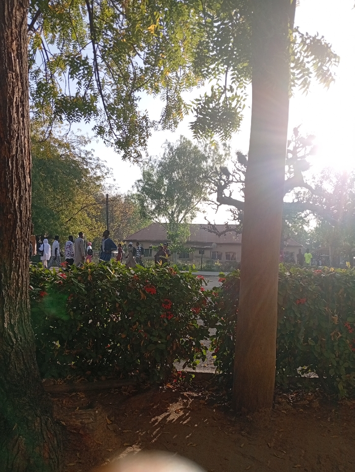 A sun-drenched outdoor scene shows a tree trunk on either side, framing a view of a hedge with red flowers. Beyond the hedge, people walk alongside a building with a visible roofline and windows. The lighting is bright, creating lens flare effects. The ground is covered in dark shadows cast by the trees above.