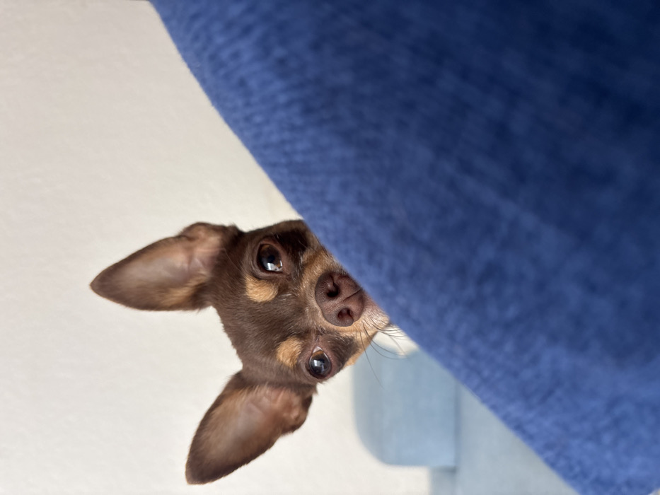 - "The image displays a headshot of a small, short-haired dog, identifiable as a Chihuahua type, peeking from behind a dark blue, textured fabric object" by FM-s7nn12, licensed under CC BY 4.0