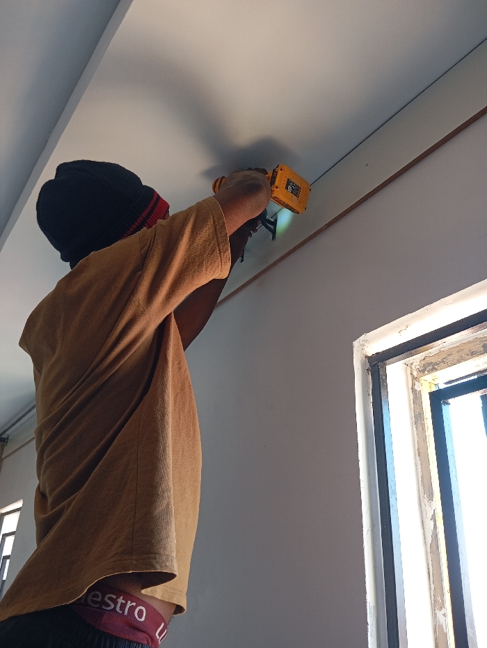 An individual is depicted performing construction or renovation work within an interior space in DU, Nigeria