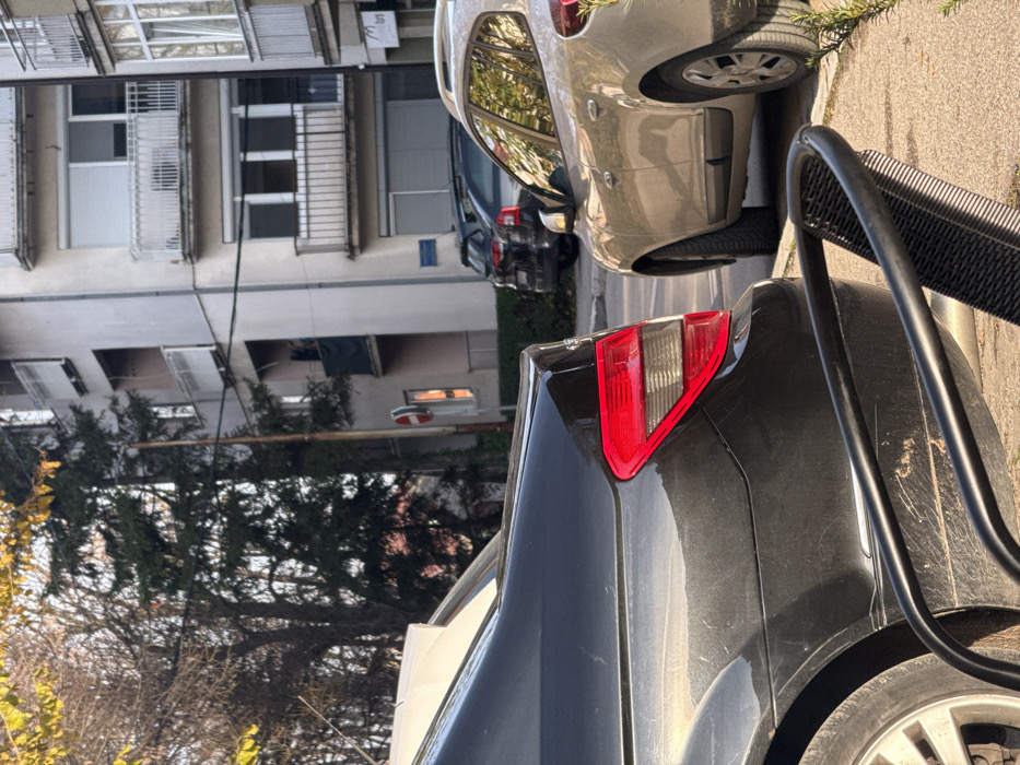 This image depicts an urban street scene in Brčko, Bosnia and Herzegovina, under clear daylight conditions. In the immediate foreground on the left, the rear right quarter panel and taillight of a dark-colored Mercedes-Benz C-Class sedan are prominently displayed; the vehicle's surface appears soiled with dust and grime. A section of a black, open-weave metal chair is visible in the bottom foreground. To the right of the Mercedes, a silver or champagne-colored SUV/crossover is parked parallel to the curb, facing away from the viewer. Further down the street, a dark-colored SUV is also parked. The background features a multi-story, light-colored residential building equipped with several balconies and windows, some of which have closed roll-down shutters. A red circular "No Entry" traffic sign is mounted on a pole situated between the parked vehicles and the building. To the right of the residential building, a portion of another building is visible, displaying a partial golden "M" logo, consistent with a McDonald's establishment. Various trees, including both conifers and deciduous trees exhibiting yellow autumn foliage, are present on the left side of the scene. No individuals are discernible within the frame.