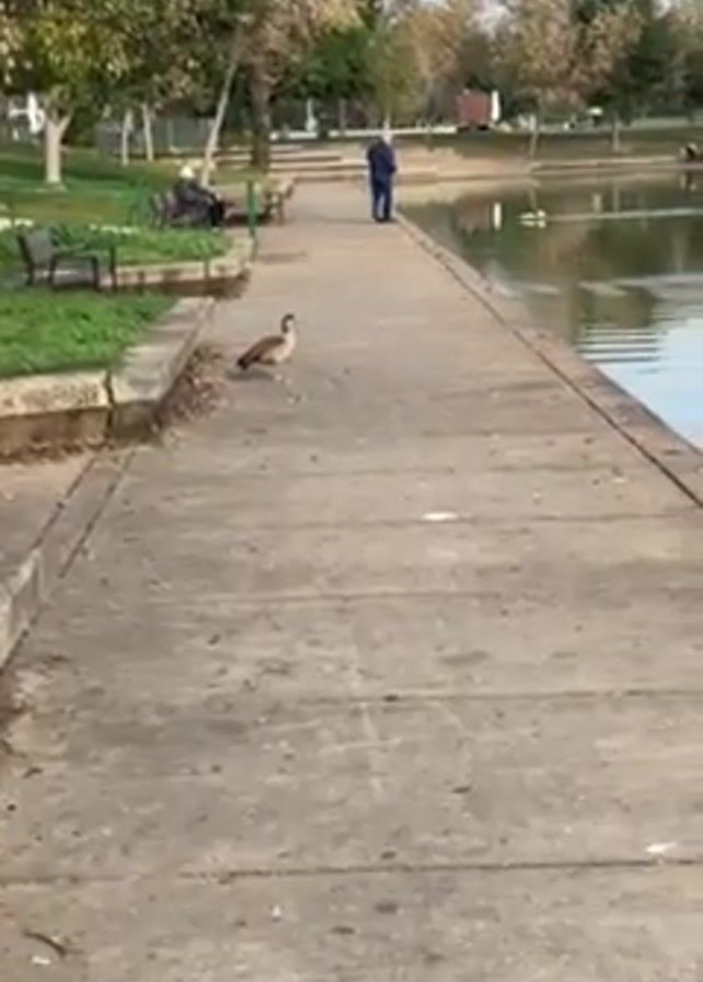concrete path next to a pond in a park. Several Egyptian geese are standing on the path near the edge of the pond. A man is standing on the path near the water, possibly fishing or controlling a small model boat in the pond. Another man is sitting on a bench further down the path. The park has trees, grass, and other benches. The sky is clear and blue.