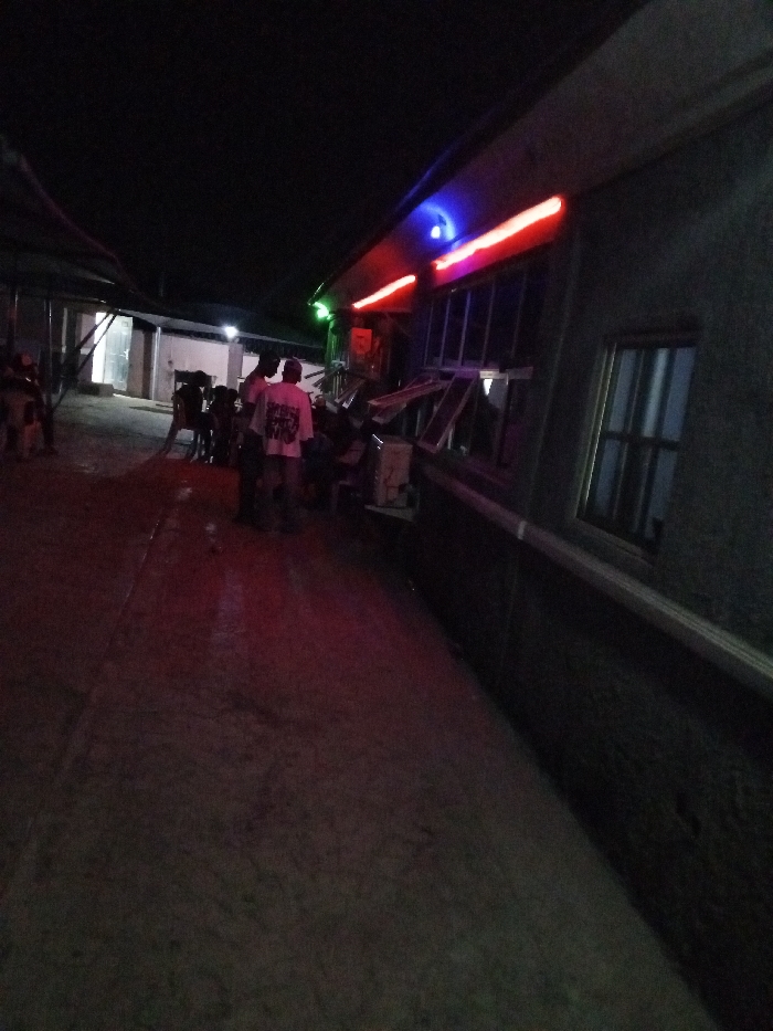 At night, a group of people gather outside a building illuminated by colorful neon lights. The building has a dark, textured exterior, with visible windows. The area appears to be a street or walkway, dimly lit with a reddish hue on the ground. A partial awning is visible on the left, casting shadows in the vicinity. The general ambiance suggests a nighttime social gathering or establishment.