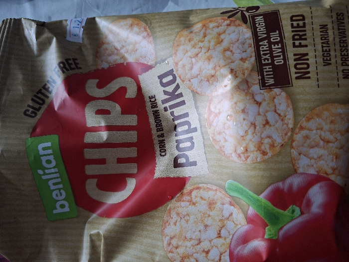 - "The image presents a close-up, slightly angled view of a "Benlian Chips" package, featuring the "Corn & Brown Rice Paprika" flavor" by FM-lcZol2, licensed under CC BY 4.0