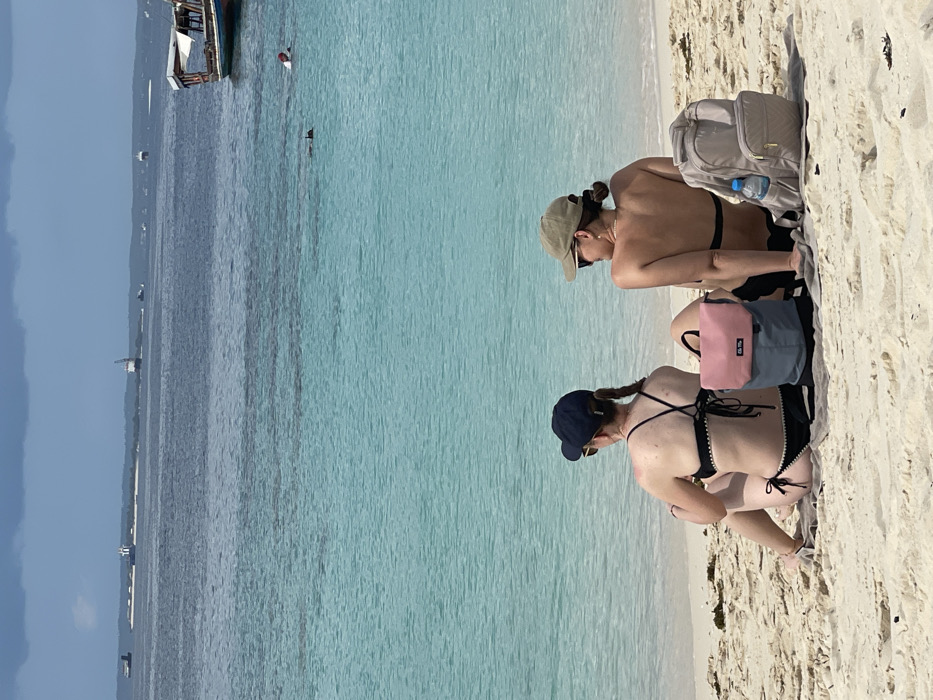 The image depicts a daytime coastal scene on a sandy beach in Zanzibar, Tanzania. Two adult females are seated on the white sand, viewed from behind, facing the turquoise ocean. The woman on the left wears a black bikini with criss-cross back straps and scalloped edges, along with a dark blue baseball cap covering light brown hair tied in a ponytail. She is seated on a light-colored towel. The woman on the right wears a black bikini top, black bottoms, and an olive green baseball cap covering light brown hair styled in two low buns. She is looking slightly to her right. A light pink and grey backpack with a flap closure is positioned between the two women. To the right of the woman on the right is a light grey quilted backpack with a plastic water bottle visible in its mesh side pocket. Both women exhibit tanned skin. The water immediately offshore is clear turquoise, transitioning to a darker blue further out. A traditional wooden boat with a canopy is partially visible on the right side of the frame in the middle distance. Two individuals are present in the water: one person with a red object (possibly a swim cap or buoy) partially submerged, and another dark head visible further left. In the far distance, several vessels are present on the darker blue ocean, including large cargo ships (one with a visible crane), smaller boats, and a distant low-lying landmass. The sky above is partially cloudy, with patches of blue and grey clouds. The scene is consistent with a beach environment near a port area within or adjacent to the city of Zanzibar.
