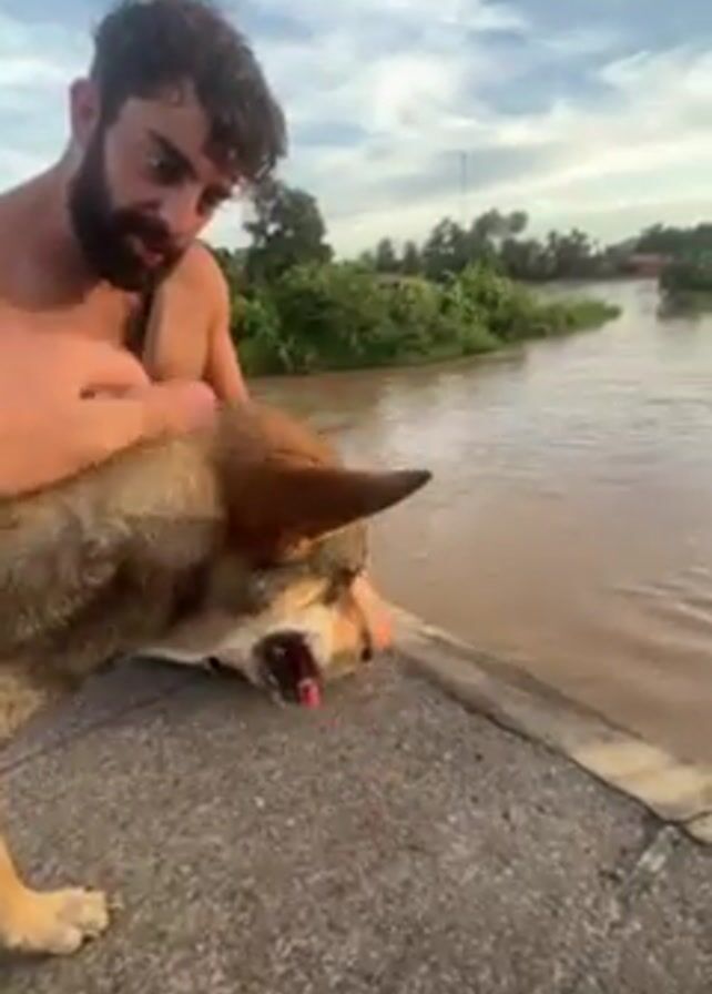 A man stands shirtless with a brown and gray dog by a river. The dog pants with its tongue hanging out. The man pets the dog on the head and back. The river is wide and muddy. The sky is cloudy. Vegetation is visible on the opposite side of the river. The scene is filmed in daylight.