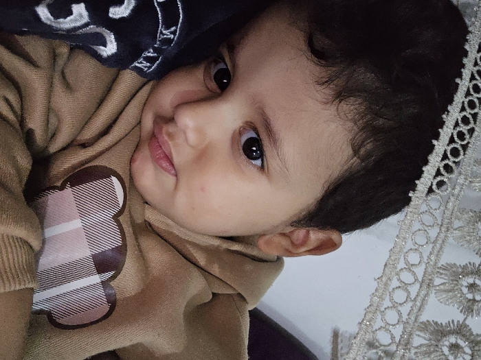 A young child lies on their side, gazing directly at the camera. The child's skin is light, with dark hair and large, dark eyes. They wear a tan hooded sweatshirt adorned with a plaid bear design on the front. A dark blue garment with white lettering is partially visible above the child's head. To the right, a white, lacy fabric is draped. The child's expression is calm and curious.