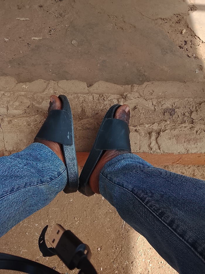 This image, captured in the city of Toro, Nigeria, displays a downward view of an individual's lower legs and feet