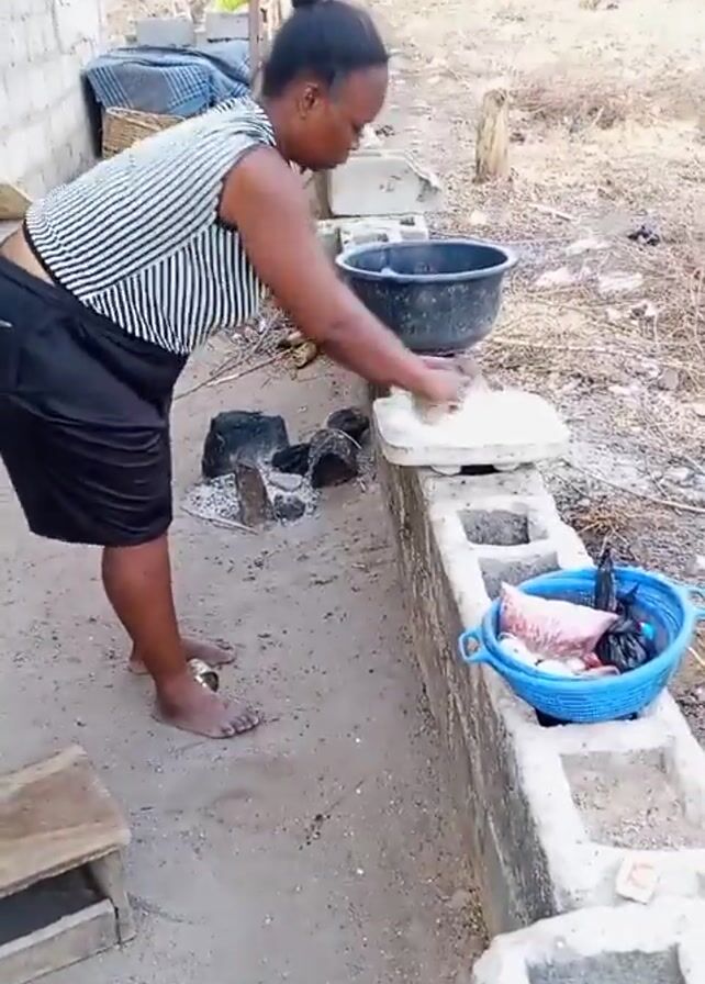 A woman grinds something on a stone platform outside, next to a blue basket containing food and a black trash bag. The woman is barefoot, and wearing a striped top and black shorts, with her hair in a bun. A child, carrying an orange container on their head and a wooden stick, stands nearby. The area appears to be a yard, with a cinder block wall, a metal fire pit and a small wooden stool.