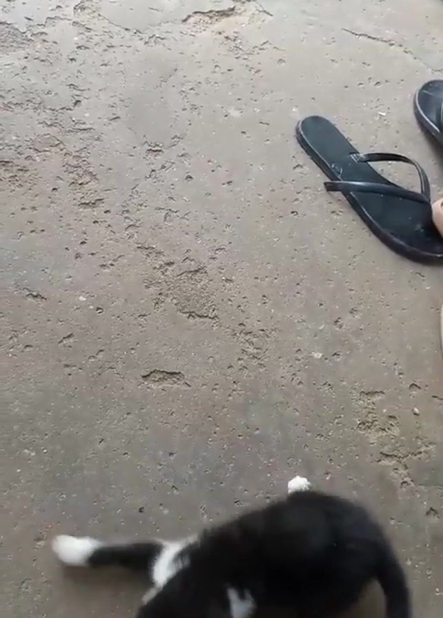 A short video shows a black and white kitten playing with a patterned strip of fabric. The kitten is on a concrete surface. In the periphery of the frame, there are several pairs of shoes, including black flip-flops and cream-colored sandals. A person is holding the fabric strip and waving it around, engaging the kitten in play. The kitten pounces and bats at the fabric with its paws, exhibiting playful behavior.
