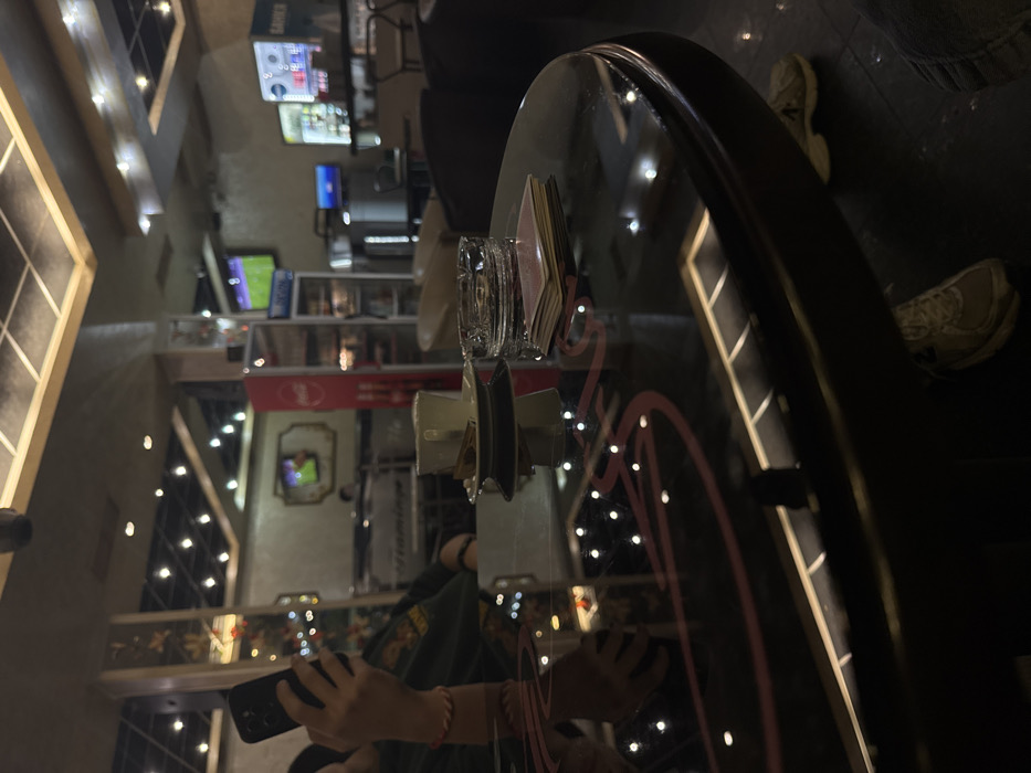 The scene depicts the interior of Flamingo Coffee Club, located at Vazrazhdane 6, Pravets, Bulgaria, observed from a low perspective at a table. The environment is dimly lit by numerous recessed ceiling lights, reflecting on various surfaces. In the immediate foreground, a dark, circular, highly reflective table features a red, stylized "Flamingo" logo visible in its surface reflection. Positioned on the table are a white ceramic cup resting on a matching saucer, containing a beverage and two small, elongated wafers. Adjacent to the cup is a clear glass ashtray. Next to the ashtray, a small stack of approximately five rectangular cards or similar items is present. To the left, a person is partially visible, primarily their right arm and hand. This individual holds a dark-colored smartphone vertically. A red and white string bracelet is worn on their wrist. Below the table, a person's lower legs and feet, clad in light-colored athletic shoes (specifically, New Balance sneakers), are visible on the dark floor. The background reveals a casual club setting. A wall-mounted television screen displays what appears to be a football match. Further to the right, a tall, red Coca-Cola branded refrigerator stands. Beyond this, a bar area is visible, equipped with additional refrigeration units (one partially labeled "SAMES"), bottles, and a second television screen also displaying sports content. Various empty upholstered chairs and booth seating arrangements are distributed throughout the space.