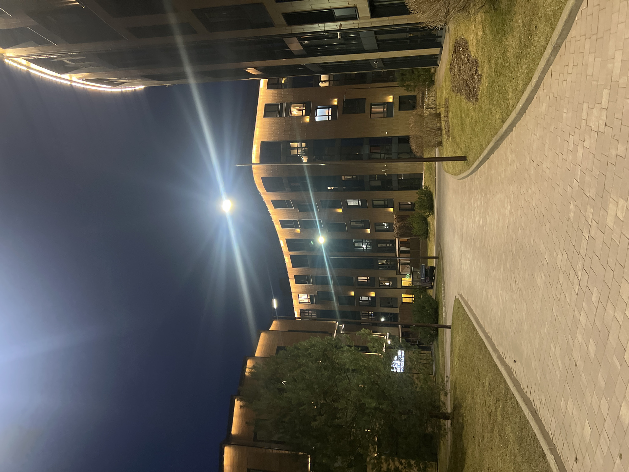 night scene in Sestroretsk, Russia. A paved walkway curves through a courtyard between modern apartment buildings. A street lamp illuminates the walkway and the facade of a multi-story building with numerous windows. Patches of grass and a few trees are visible alongside the walkway. The night sky is dark blue.