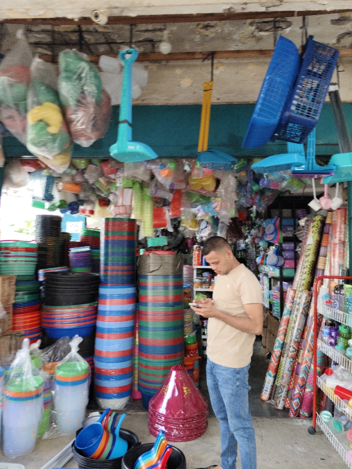 Inside a packed store, a man in a beige shirt and jeans is looking at his phone. He is standing among towering stacks of colorful plastic tubs and containers. Overhead, more plastic items hang from the ceiling. Rolls of patterned fabric and a metal rack filled with products are visible to the right. The store appears to sell a variety of household and plastic goods. A security camera is attached to the ceiling.