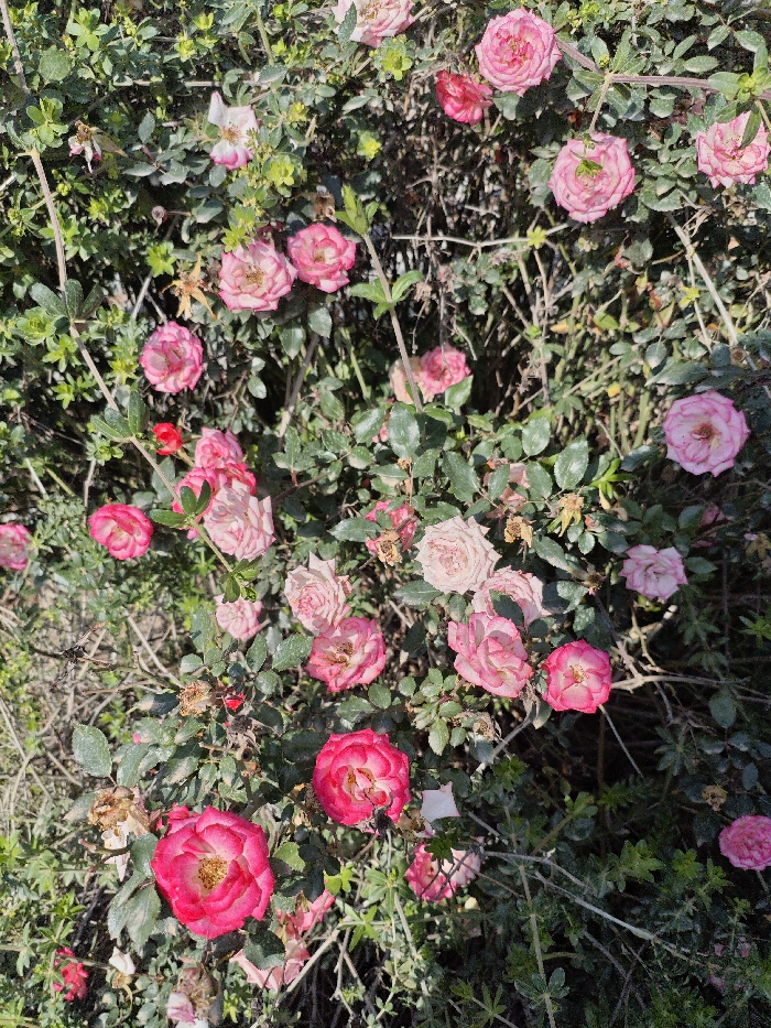 A dense bush of pink and red roses with dark green leaves fills the frame. The roses vary in shade and bloom, some fully open and others just budding. Brown, leafless twigs intertwine within the bush, adding depth and texture. The overall impression is a natural, slightly overgrown rose garden.