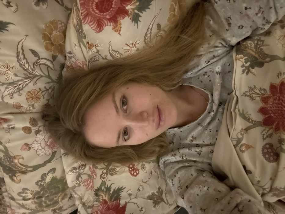 - "A woman with long blonde hair and fair skin lies on a bed with floral patterned sheets and a duvet" by FM-yjK1X2, licensed under CC BY 4.0