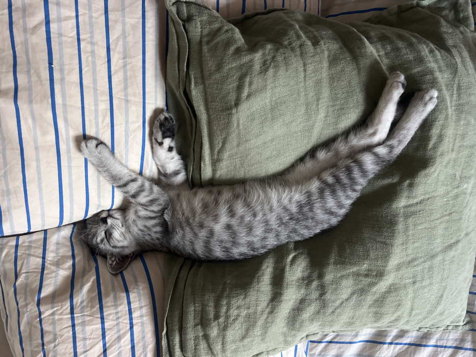 This image depicts a domestic cat in a state of repose on a bed, located in a residential area of Tel Aviv, Israel. The subject is a silver tabby cat, characterized by grey fur with darker grey horizontal stripes across its body and limbs. The animal is positioned centrally, lying fully stretched on its back. Its head rests on a pillow covered by a white pillowcase featuring horizontal stripes in shades of blue. The cat's body extends over a large, rectangular olive-green textile object, likely a duvet or cushion, which occupies the lower two-thirds of the frame. Its four limbs are extended: the two forelegs are stretched upwards and outwards, with visible dark paw pads on the right forepaw, while the two hind legs are extended downwards, appearing relaxed. The cat's eyes are closed, indicating it is asleep. The scene is illuminated by an ambient light source, casting soft shadows. No other individuals or objects are visible within the frame.
