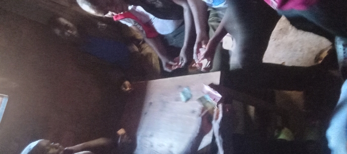 The image depicts an indoor scene in Borabu Chitago ward, Kenya, illuminated by dim, ambient light. Five individuals, primarily adult males, are observable within the enclosed space, gathered around a rectangular wooden table. On the surface of the table, multiple Kenyan Shilling currency notes, identifiable by their blue-green and pink-purple denominations, are scattered. A stack of these notes is visible near hands on the left side of the table. On the right side of the table, at least two individuals are actively holding and examining playing cards. One subject, wearing a white shirt with red accents, holds a fan of cards in their hands. Another pair of hands below theirs also clutches playing cards. One individual is partially visible on the far left, leaning forward towards the table. Two additional blurred figures are present in the background, behind the table. The environment appears to be a basic room with muted, possibly earthen-colored walls. The collective activity suggests a social gathering engaged in a card game involving currency.