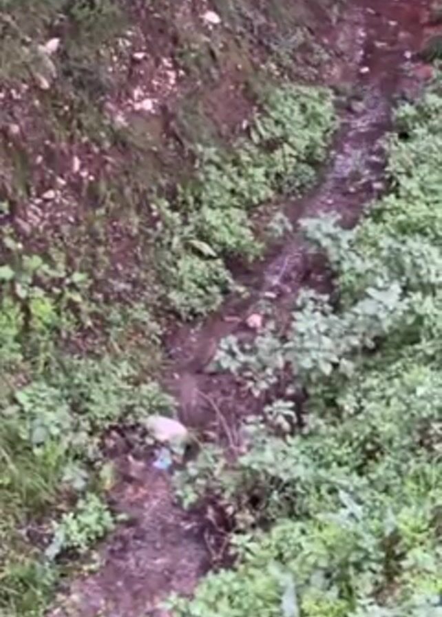 The camera looks down into a small, narrow, and shallow stream or gully filled with muddy water