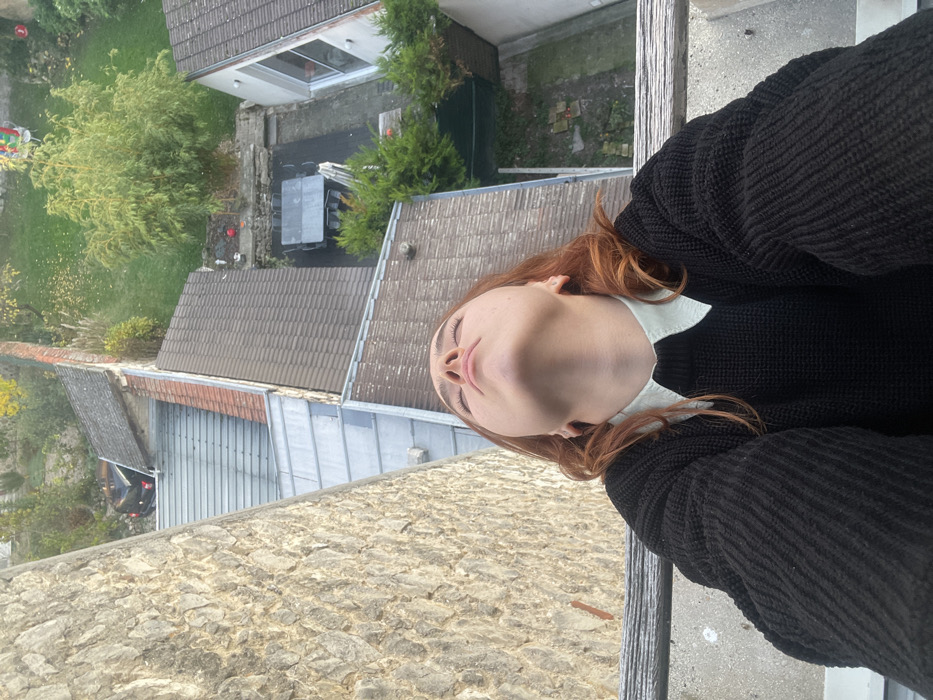 An overhead-angle photograph depicts a young individual with reddish-brown hair and a light complexion, seen from the upper torso, looking upwards with closed eyes and an elevated chin. The individual wears a black knitted long-sleeved sweater over a light-colored collared shirt, possibly mint green. A wooden railing is visible horizontally across the lower foreground, suggesting the individual is positioned on a balcony or elevated platform. To the left, a sturdy stone wall constructed from irregular, light-toned blocks runs vertically. The background reveals a densely packed urban residential area, consistent with a French city like Reims, viewed from a significant height. Below, a complex arrangement of pitched roofs with various tiles (dark brown and terracotta hues) and some grey metal roofs is visible. Numerous private courtyards and gardens are interspersed between the buildings. One prominent garden features a well-maintained green lawn with several trees, including one resembling bamboo, and evergreen shrubs. Another area displays a paved patio furnished with a dark-colored outdoor table and chairs. In a different courtyard, a dark-colored SUV or minivan is parked. Various stone and brick walls delineate property boundaries throughout the scene. The overall environment suggests an established residential neighborhood. A precise street address within Reims is not identifiable from the visual information alone.