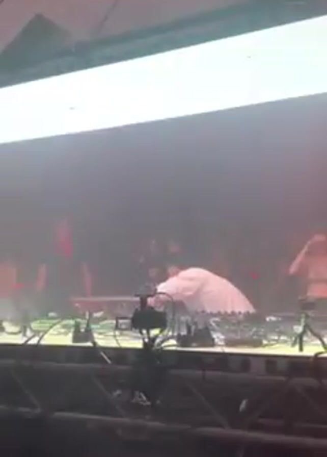 A DJ in a white Adidas track suit stands behind a lighted sound board on a stage and raises his right hand. Behind the DJ are several people silhouetted against a bright light. The stage has metal supports.