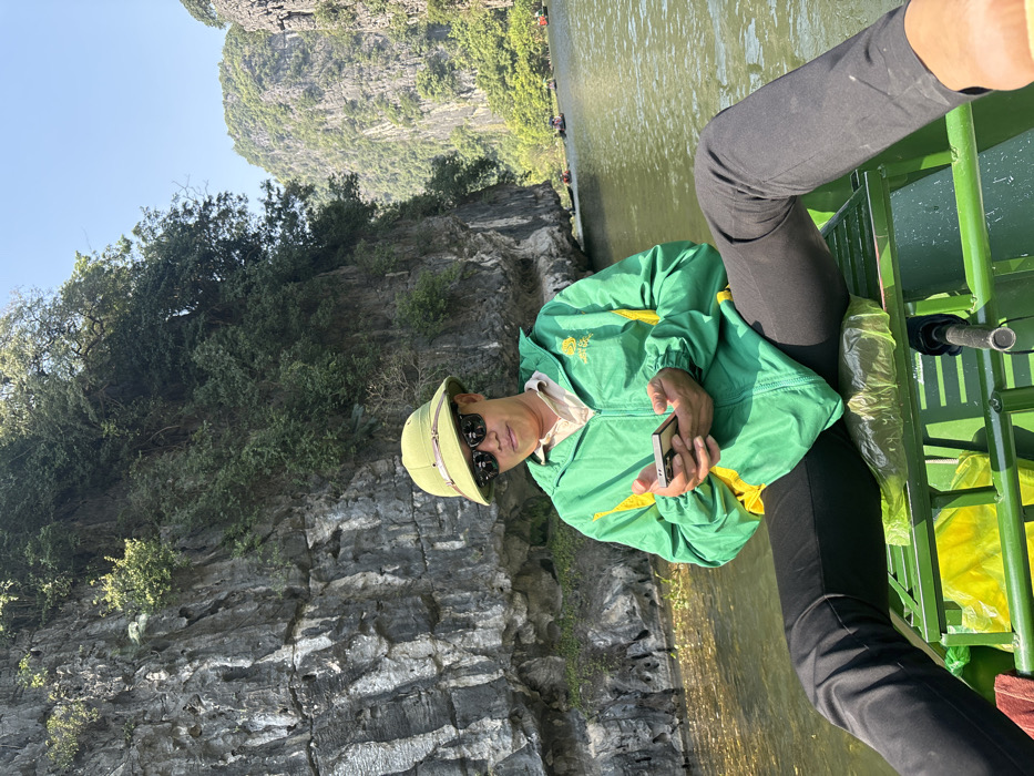 A person wearing a green jacket, pith helmet, and sunglasses sits on a green metal boat while holding a phone. The person has black pants. The background includes a rocky cliff with green trees and a waterway. The lighting indicates a sunny day. Part of another person and the boat are visible on the right edge of the photograph.