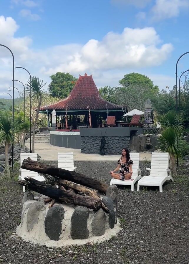 woman sitting in a lotus position on a white deck chair, against a backdrop of a Balinese-style pavilion. The area is filled with volcanic gravel, and a circular fire pit with charred logs is prominently featured in the foreground. There are three additional white deck chairs nearby. The Balinese pavilion, with its distinctive red tile roof, sits on a slightly elevated platform, visible in the background. Palm trees, tall lighting poles, and other greenery surround the area. The sky above is blue with scattered clouds, suggesting a pleasant day. The woman is the focal point, seemingly engaged in meditation or quiet contemplation.