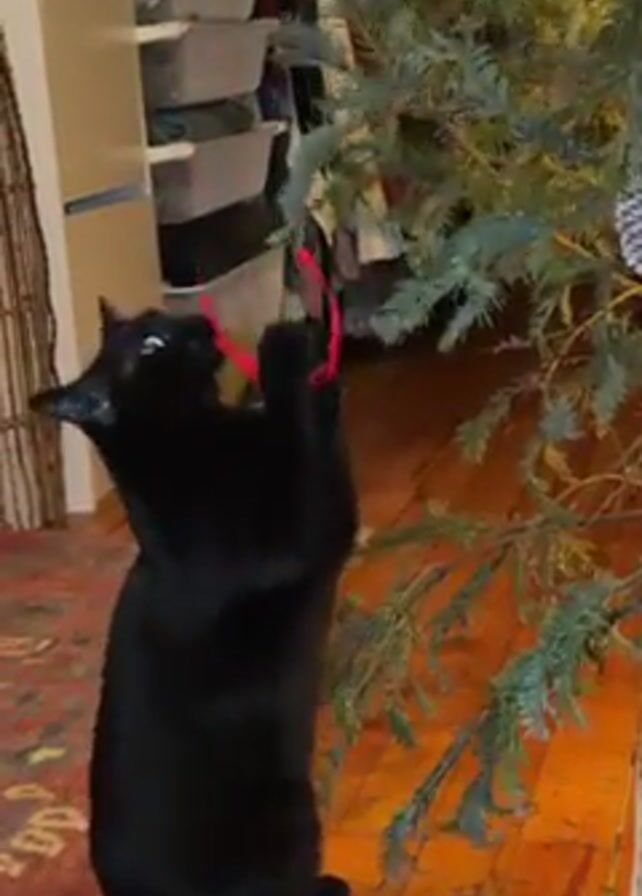 - "A black cat is standing on its hind legs, reaching up to a sparsely decorated Christmas tree" by FM-AJf9d2, licensed under CC BY 4.0