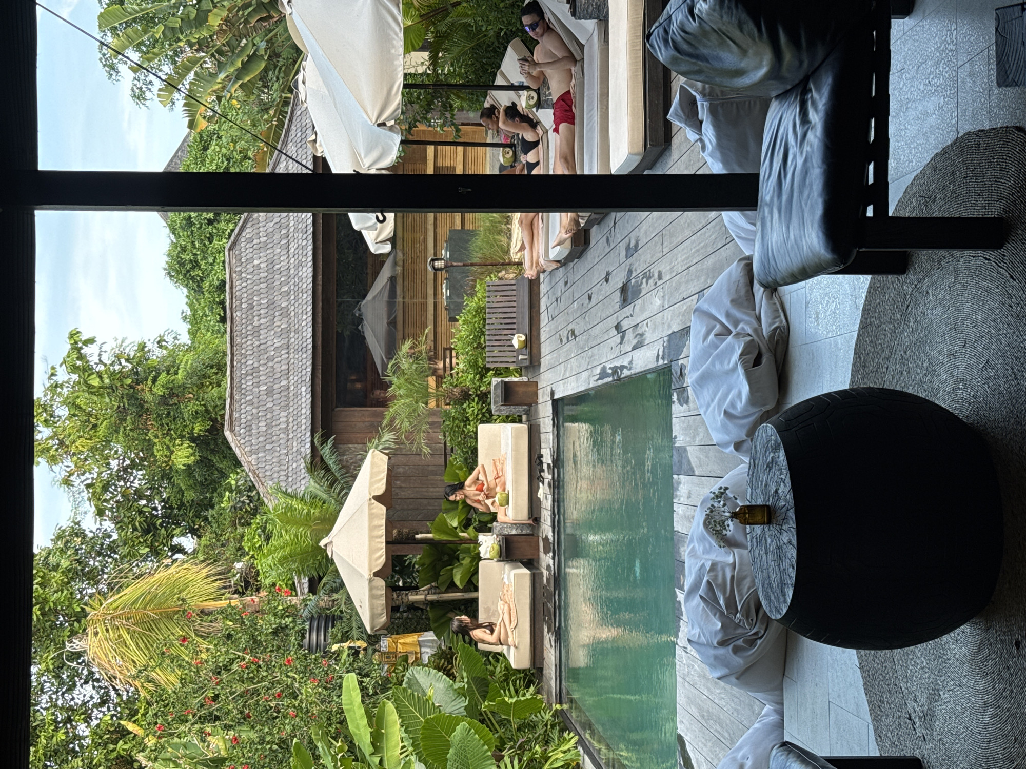 Captured from an interior perspective, the image reveals a tropical outdoor scene in Pererenan, Indonesia. A rectangular swimming pool dominates the foreground, adjacent to which are two women lounging on deck chairs under large umbrellas. Further back, a group of three individuals, including a man in red swim trunks, relaxes on loungers. The scene is framed by lush greenery, including palm trees and various tropical plants, and wooden architecture. The interior foreground features a dark, rounded wooden table with a small vase of white flowers, placed on a textured rug next to white cushions. The scene offers a view into a serene outdoor living space, blending tropical foliage with luxurious relaxation.