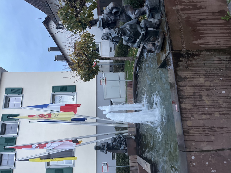 The image depicts a multi-figure bronze fountain situated in Oppenau, Germany. The fountain basin, dark-toned and appearing to be concrete or weathered stone, exhibits vertical dark streaks indicative of water runoff and mineral deposits. Multiple water jets actively propel streams upwards from the basin. On the left side of the fountain, two bronze statues are positioned: an adult male figure stands, holding a long, slender object (possibly a tool or staff), while a smaller figure (child or youth) is seated at his feet, looking towards the standing figure. On the right side of the fountain, three additional bronze statues are grouped. A male figure is seated, wearing an apron, actively engaged in a task with a tool in front of him. Behind him, a standing male figure wears a hat and holds a cylindrical container, while a partially obscured female figure, wearing a head covering, stands between the two male figures. In the background, a light-colored, multi-story building features several windows with dark green louvered shutters. To the right of this building, another white-facaded structure with a dark, sloped roof and two dark chimneys is visible. Five flags are displayed on individual metal poles positioned in front of the primary building. From left to right, these include a yellow and black flag, a white flag with a red crest, a partially visible German flag (black, red, gold), a yellow flag with red text, and the French national flag (blue, white, red). Two informational placards on metal stands are present near the fountain; one on the left displays a portrait. A gray utility box is located behind the fountain, to the right of the flags. The surrounding environment includes small, deciduous trees with sparse, yellow-brown autumnal foliage, and a grassy area. The sky is uniformly overcast.
