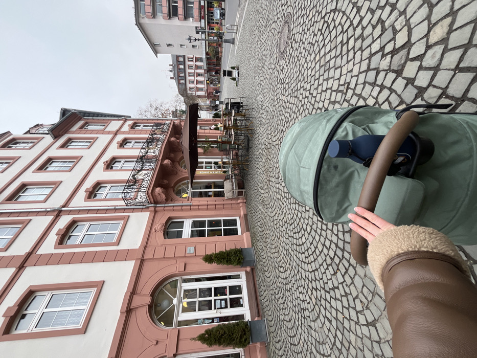 The scene depicts an outdoor urban environment on Brandgasse in Mainz, Germany, under an overcast sky. In the immediate foreground, a person's right arm, wearing a brown jacket with a tan sherpa lining, is pushing a light sage-green baby stroller. A dark blue water bottle is secured in a holder on the stroller's brown handlebar. The ground is paved with grey cobblestones arranged in a fan-shaped pattern. To the left, a multi-story building with a light cream facade and reddish-pink architectural trim is visible. It features numerous white-framed windows and arched ground-floor entrances. A double-door entrance is flanked by two potted evergreen trees. Adjacent to this, a cafe terrace, identified by a partially visible "GUTEN DINGE" sign, extends onto the cobblestones. The terrace contains several small black tables with matching chairs, a bench against the building, and a large brown patio umbrella. A decorative garland is draped across the first-floor balcony railing above the cafe. In the background, a street runs parallel to the main building, lined with additional multi-story buildings displaying similar European architecture. Streetlights are present, and minimal pedestrian activity is observed further down the street.