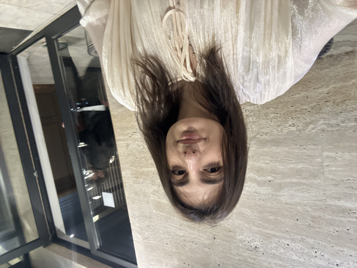 A woman with dark hair and fair skin wears a cream-colored, slightly sheer top with a tie at the neck. She is positioned indoors with what appears to be a marble-like wall behind her. To the left, there is a doorway reflecting light and showing a glimpse of an interior space. The image seems to be a selfie or photo taken at close range, with the woman looking directly at the camera.