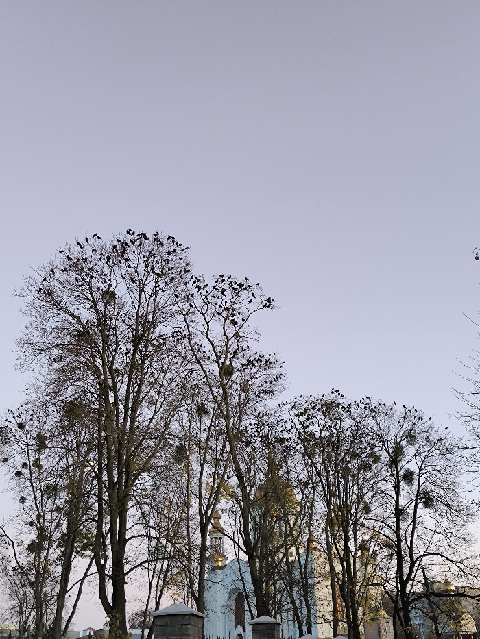 The image displays an outdoor scene in Rivne, Ukraine, under a light lavender-grey sky. A dense cluster of leafless deciduous trees dominates the middle ground. Hundreds of small, dark birds are perched throughout the upper branches of these trees, appearing as numerous black silhouettes. Several spherical clumps, consistent with mistletoe, are visible on the tree branches. Partially obscured by the trees in the lower-middle section is a building with light blue walls and multiple golden domes or cupolas, along with reddish-brown architectural detailing around an archway, consistent with the Holy Resurrection Cathedral. In the immediate foreground, the tops of two stone pillars or fence posts are visible. No human figures are present.