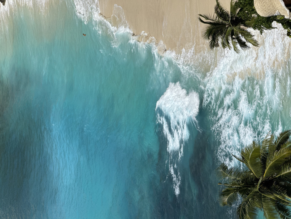 The image displays an elevated, oblique view of a coastal scene in Pejukutan, Indonesia. The majority of the frame is filled with dynamic turquoise and deep blue ocean water, where white-capped waves break towards a light tan sandy beach. A significant, white-foamed wave crests in the mid-left. Near the upper right portion of the sandy shoreline, a small, dark, elongated object is visible in the shallow water. The lower corners of the frame are partially occupied by the green fronds of two palm trees. In the bottom right corner, a portion of a light-colored, possibly woven, object is discernable amidst tropical foliage. No individuals are depicted.