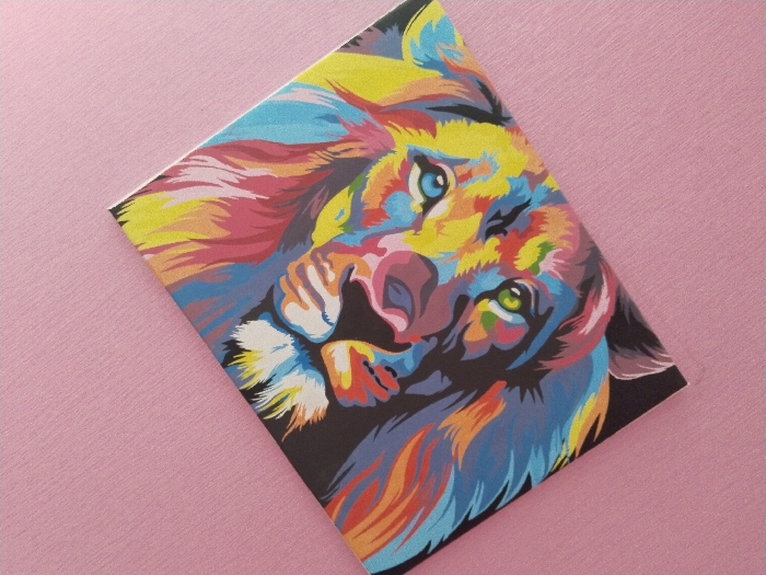 A rectangular, pop-art style painting depicting a lion's head is positioned diagonally on a uniformly textured pink surface