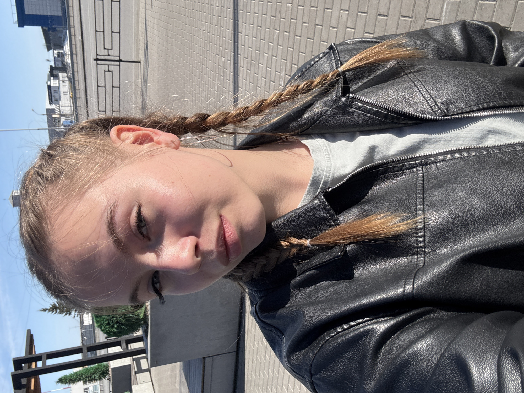 A young woman stands outside in Ufa, Russia. She has blonde hair styled in two braids and wears a black leather jacket over a light gray shirt. She gazes at the camera. Behind her are gray brick pavers, a modern building, trees, and what appear to be black metal pedestrian barriers. The sky is a clear light blue, indicating daytime.