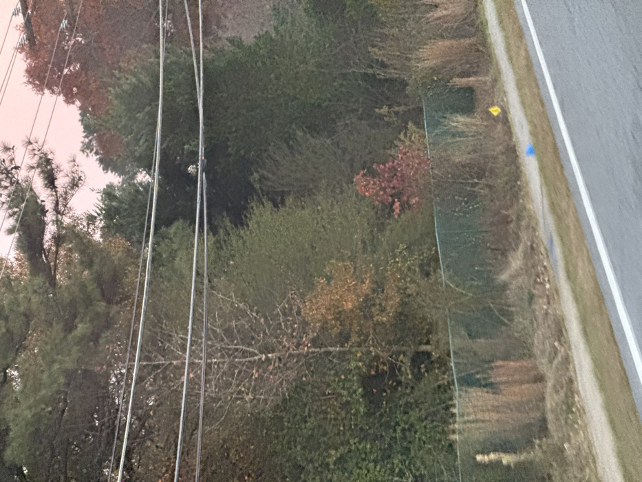 A landscape view shows trees with varying foliage, from dense green to sparse autumnal hues, next to a paved road. The roadside is bordered by low vegetation. Utility wires crisscross the scene. Small yellow and blue markers are visible along the road edge. The sky appears light-colored, possibly at dawn or dusk.