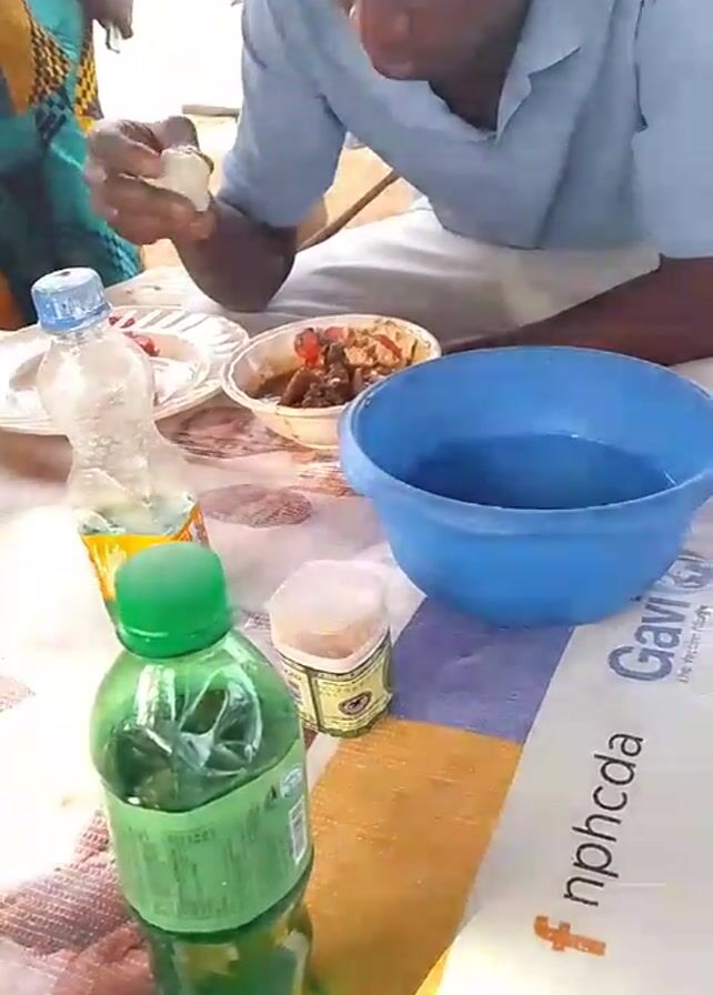 A man is seated at a table, eating a meal with his hands. The table is covered with a tablecloth that has a logo with the text "nphcda". In front of the man is a bowl of what appears to be stew, a blue bowl filled with water, two bottles of soda (one green and one orange), and a small container. The man is wearing a light blue shirt and white pants. Someone wearing a colorful fabric is standing to the left of the frame. The scene is outdoors, with visible shadows and natural light.