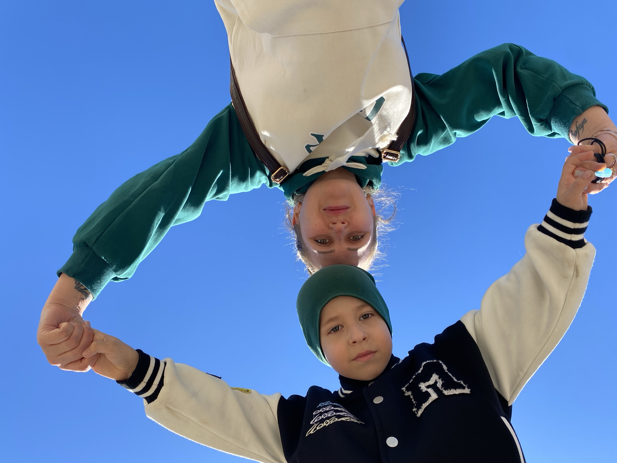 Two individuals, one a woman and the other a child, are oriented upside down against a clear blue sky. The woman is wearing a white and green hoodie with brown straps visible. The child is wearing a green beanie and a black and white jacket. They are holding hands. The location cannot be definitively determined to be Марковский, Russia, based on visual information alone.