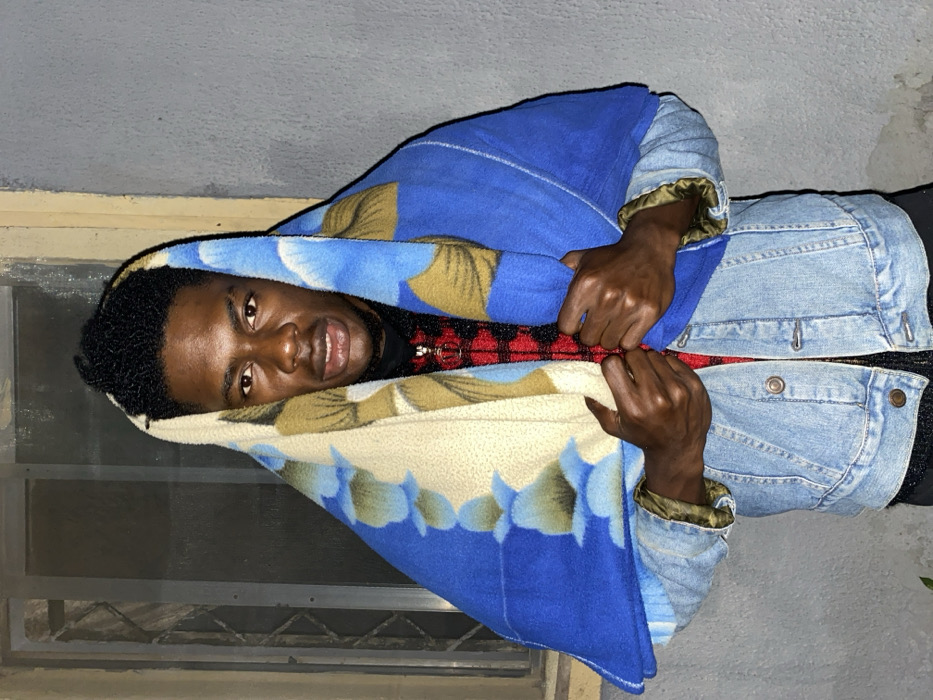 A dark-skinned male, appearing young, stands centrally in the frame against a plain, light grey wall in Udu, Nigeria. He has short, dark, textured hair and a neutral expression with his mouth slightly open, looking directly forward. He is wearing a light-wash denim jacket over a red and black plaid shirt, beneath which a dark garment with a subtly reflective texture is visible around the collar. A small, dark pendant hangs around his neck. He is draped with a blue, cream, and olive green patterned blanket featuring a floral or leaf design, which covers his head and shoulders. His hands are positioned at chest level, holding the edges of the blanket. To his left, a section of a window with a light-colored frame and dark vertical security bars is visible against the wall. The scene is illuminated by an artificial light source, casting minimal shadows.
