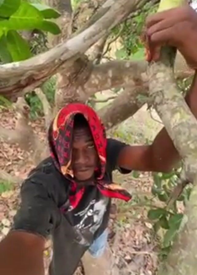 A person with dark skin, wearing a red headscarf, black graphic tee shirt, and light wash jeans, is hanging from a tree branch