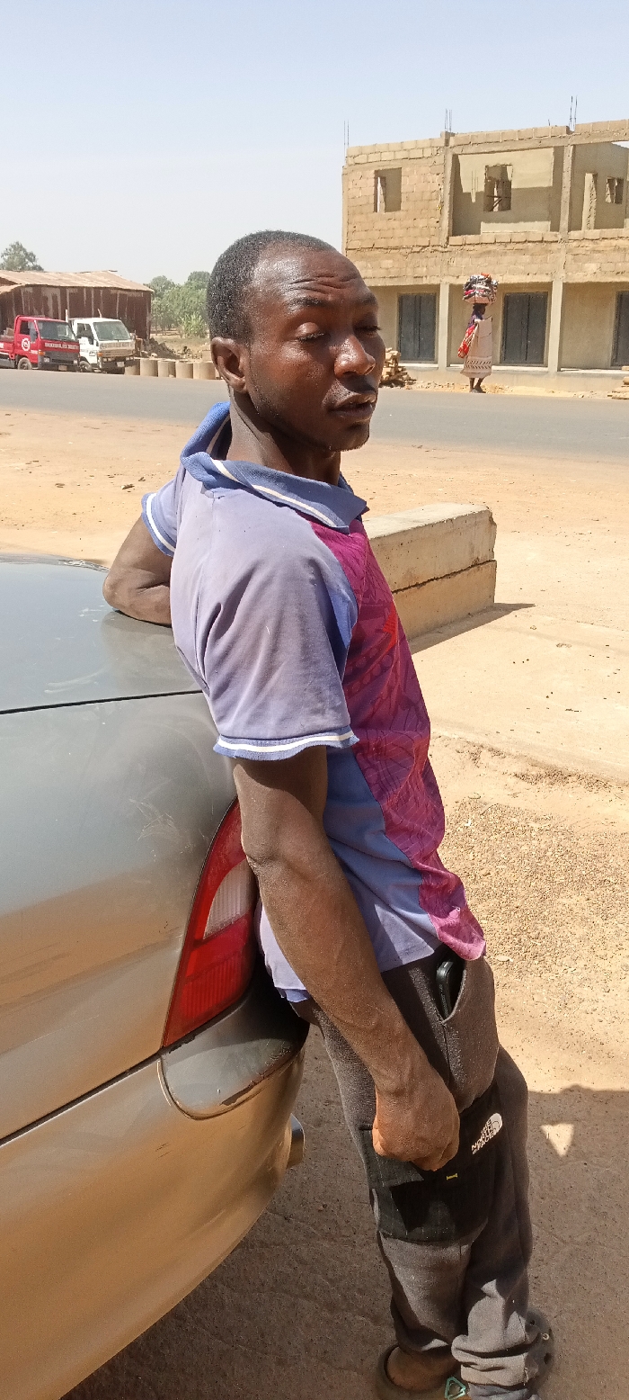 This image depicts a dusty roadside scene in Barakin, Nigeria, under bright daylight. In the foreground, a male of African descent leans against the rear passenger side of a light-colored sedan. He wears a faded light blue and magenta patterned polo shirt, dark grey tracksuit bottoms, and open-toed footwear. A black smartphone is visible in his right pocket. His left forearm rests on the car's trunk/fender. His head is turned slightly to his right, with eyes partially closed. The car is a silver or light gold sedan, showing signs of wear and dirt, including scratches on the bodywork and bumper. In the mid-ground, a paved road stretches across the frame. To the left, two small pickup trucks, one red and one white, are parked on or beside the road, in front of a corrugated metal structure. Several circular concrete barriers or pipes are also visible on the unpaved shoulder. To the right, on the opposite side of the road, a multi-story building constructed from light-colored bricks is partially visible. This structure appears to be under construction, with exposed rebar on the roofline and some window openings fitted with dark frames on the lower level. A second individual, a person in a light-colored dress carrying a bundle on their head, walks on the paved road in front of this building. Two rectangular concrete blocks lie on the dusty ground between the main subject and the road. The sky is bright and clear. The ground throughout the scene is a mix of paved asphalt and dry, light brown earth.
