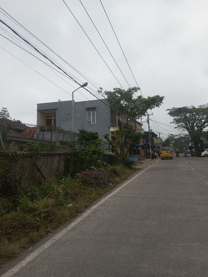 The scene captures a street in Nuwara Eliya, Sri Lanka, under an overcast sky. A paved asphalt road, featuring a continuous white line along its left edge, recedes into the distance. To the immediate left of the road, a concrete retaining wall, partially covered by overgrown weeds, grass, and clusters of small purple flowering plants, supports a dark metal fence. Behind this fence, a two-story residential building with a grey exterior is visible. This structure includes a first-floor balcony and a prominent white-framed window on its second level. A grey street lamp post stands in front of this building. Adjacent to and beyond this building, a dense collection of green trees and foliage is present. On the right side of the road, further down, a yellow passenger van is parked. A small group of approximately three to four individuals stands on the sidewalk near the van. Beyond this point, several motorbikes, some occupied by riders, are visible on the road, along with a white vehicle parked further ahead. The upper portion of the image is dominated by numerous black overhead utility lines spanning the frame, supported by multiple utility poles positioned along the right side of the street. Large, mature trees with dense canopies line the right side of the road, extending into the background. Additional buildings and structures are visible along both sides of the road in the midground and background. The sky is uniformly grey and cloudy.