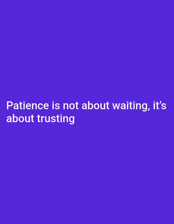 The image displays a digital graphic featuring a uniform purple background. Centrally aligned white sans-serif text is present, stating: "Patience is not about waiting, it's about trusting." No individuals, physical objects, actions, or interactions are depicted. The environment is entirely graphic and abstract, providing no visual cues to a real-world setting. Consequently, no specific geographical location within the city of Ouislane, Morocco, or any other physical place, can be determined from the image content.