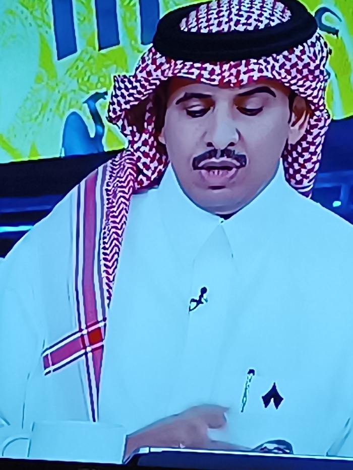 The image displays a close-up, chest-up view of one adult male situated in what appears to be a studio or broadcast environment in Unknown, Unknown. The individual has Middle Eastern features, including dark hair and a mustache, with his eyes cast downward and mouth slightly open, suggesting he is speaking or paused. He is dressed in a white thobe with a collared neckline and wears a red and white checkered ghutra secured by a black agal. The ghutra features a distinctive pattern of red and white chevrons, and a section draped over his left shoulder displays a vertical stripe with a horizontal band forming a red square in the center on his left chest. A black lavalier microphone is clipped to the right side of his collar. On the right chest area of his thobe, a black stylized symbol is visible above the Arabic numerals "١٨". His hands are clasped together at the bottom of the frame, resting on an unseen surface. The background is out of focus, exhibiting abstract shapes and colors, predominantly yellow-green and blue, with a distinct blue shape visible to the left of the subject's head.