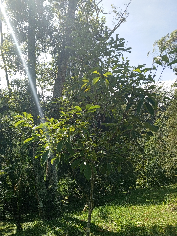 Sunlight streams through a forest clearing, illuminating a small, verdant tree in the foreground