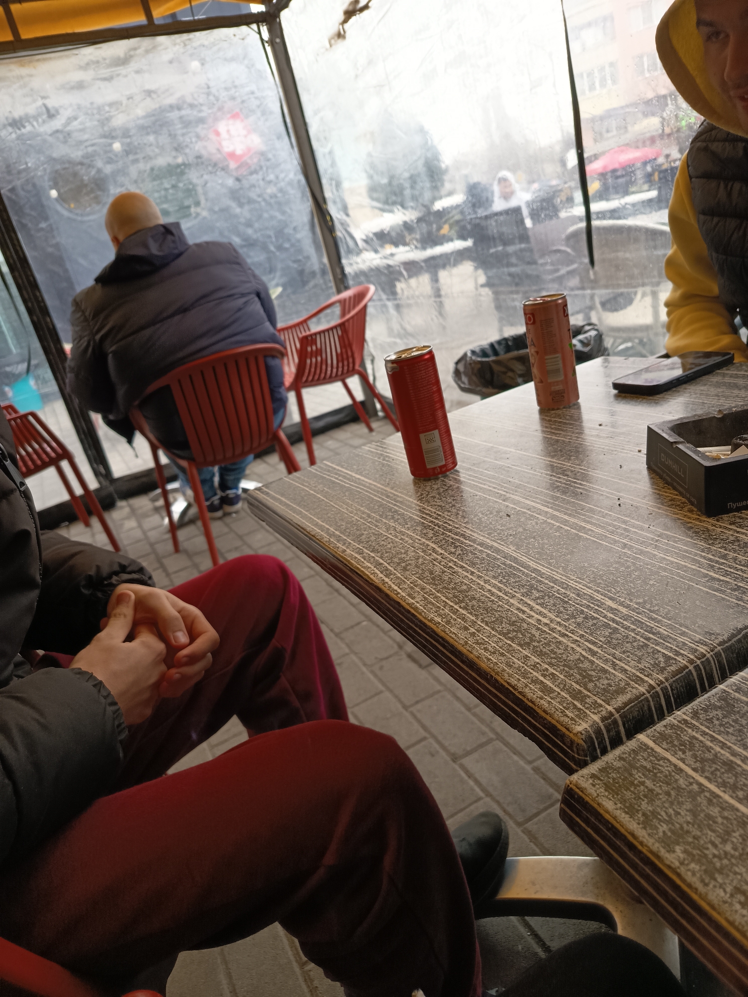 The image depicts an outdoor cafe scene, possibly in Sofia, Bulgaria, given the presence of Cyrillic script on an ashtray labeled "Dunhill". Three people are partially visible: one seated with their back to the camera wearing a dark jacket, one seated in a yellow hoodie with a black vest, and one seated person wearing a black jacket and red pants, visible from the chest down. The table holds two open soda cans and a smartphone, as well as an ashtray with used cigarettes. The environment is enclosed by a transparent plastic covering, indicating an outdoor seating area. Through the plastic, one can see buildings and other figures in the background, suggesting a bustling urban location. Red plastic chairs provide seating.