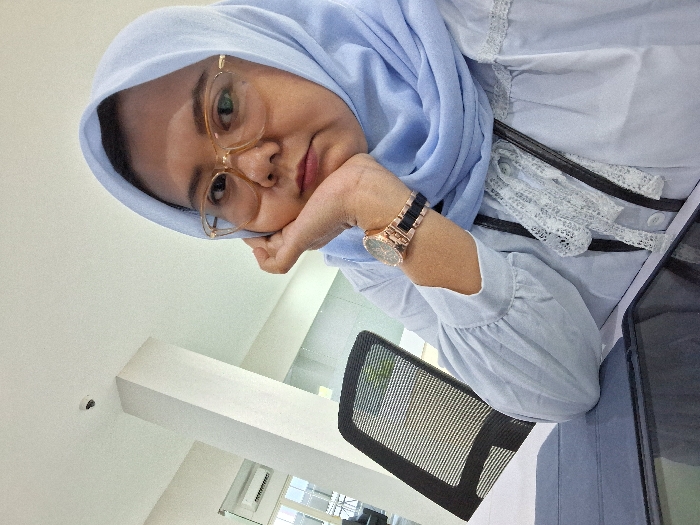 A person wearing a light blue hijab and gold-framed glasses rests their head on their hand, wrist adorned with a two-tone watch. They wear a light blue top with white lace details. A black mesh office chair is visible in the background, as well as a white wall. The angle suggests the picture was taken at a tilted perspective.