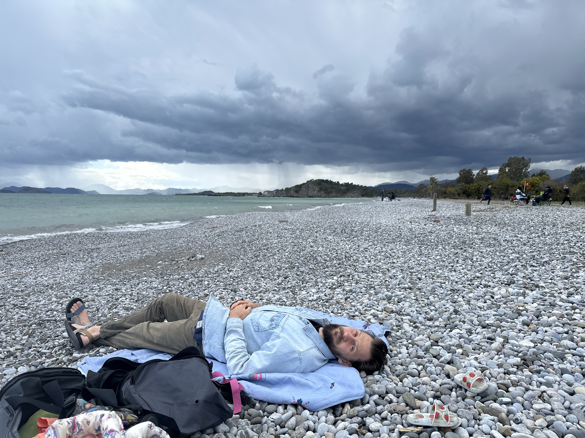 The image depicts a man lying on a pebble beach in Fethiye, Turkey. He is positioned on a light blue blanket and is wearing olive-green trousers, a denim shirt, and dark sandals. His hands are resting on his stomach. A black backpack and floral patterned shoes are nearby. The beach is made of small, smooth pebbles and extends to a shoreline with overcast skies. In the background, there is a line of trees and shrubs. Further down the beach, there are groups of people, some seated under umbrellas, and others walking. Dark rain clouds fill the sky, and in the distance, a darker patch of rain can be seen falling over the water. The overall scene is a mix of relaxation and an approaching storm.