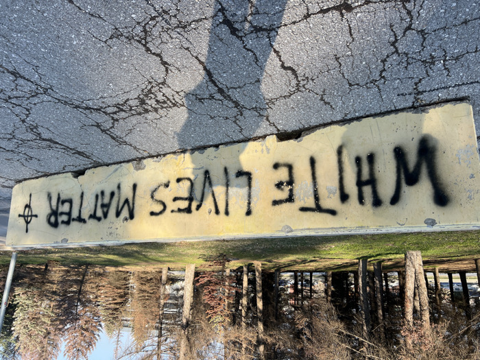 The image displays a weathered, light-yellow concrete traffic barrier positioned horizontally on cracked asphalt pavement. Across the barrier's surface, the phrase "WHITE LIVES MATTER" is spray-painted in black, capitalized letters. To the right of "MATTER," a black spray-painted symbol resembling a cross with a horizontal line through its top arm and a circle encompassing the intersection is present. The scene is illuminated by strong sunlight, casting elongated shadows onto the pavement. In the background, a grassy area with numerous bare deciduous trees is visible on the left, while a denser cluster of evergreen trees appears on the right, partially obscuring indistinct buildings. No people or interactions are visible. The setting is an outdoor urban environment within Sofia, Bulgaria, likely an area adjacent to a park or green space.